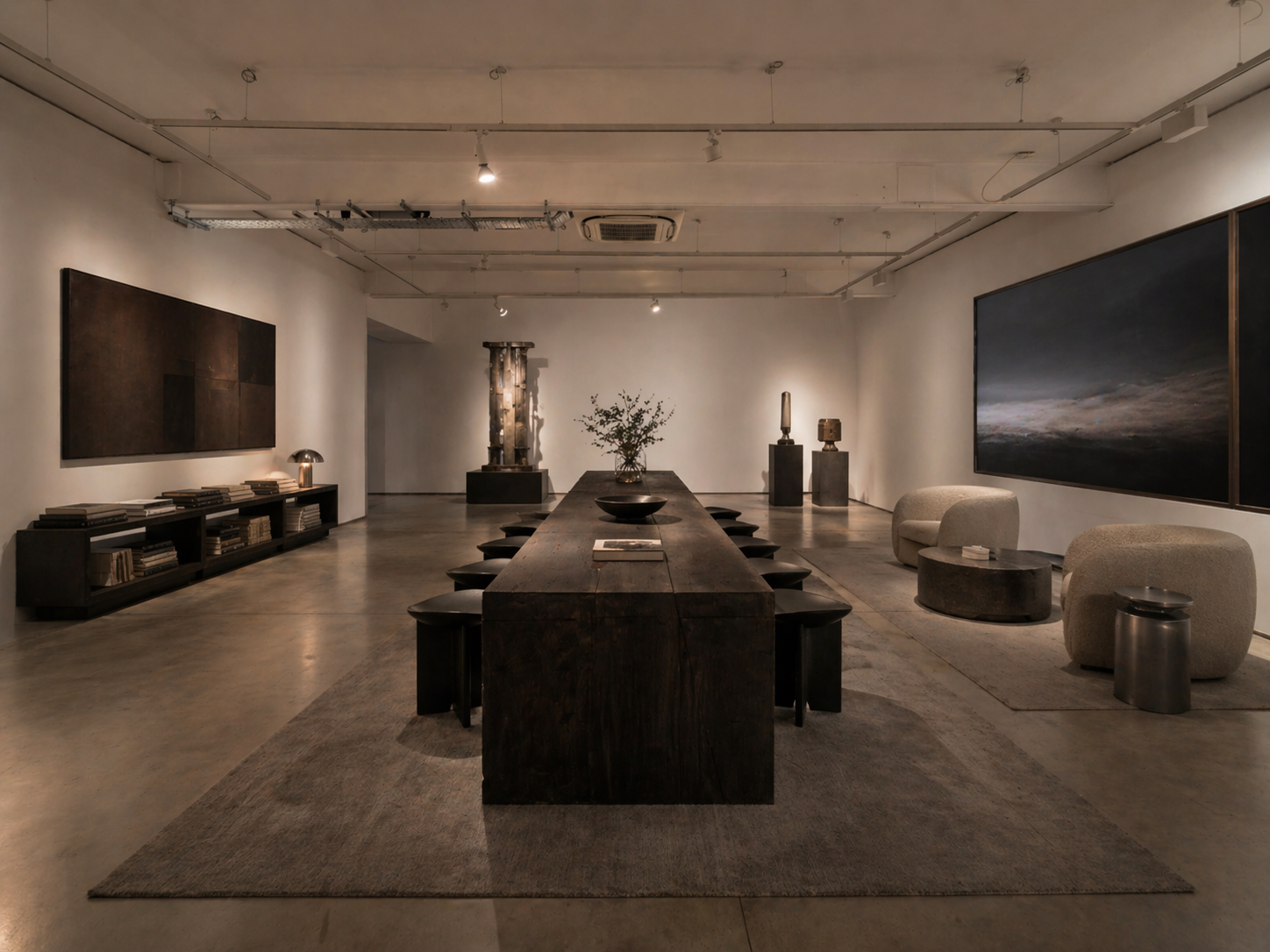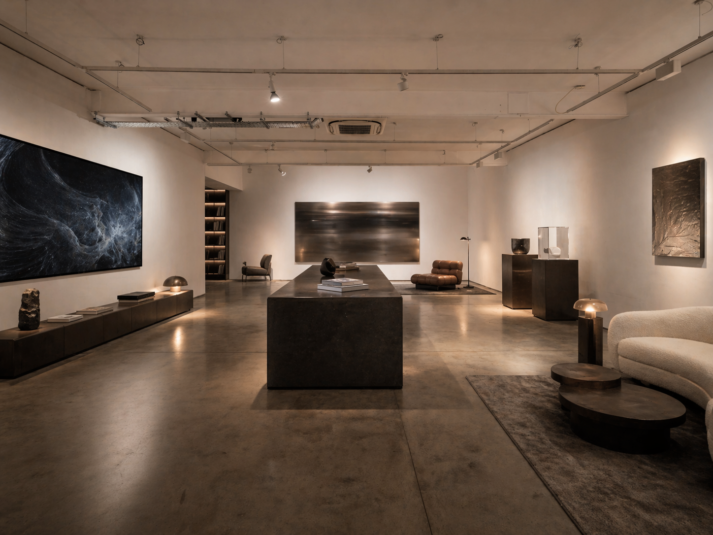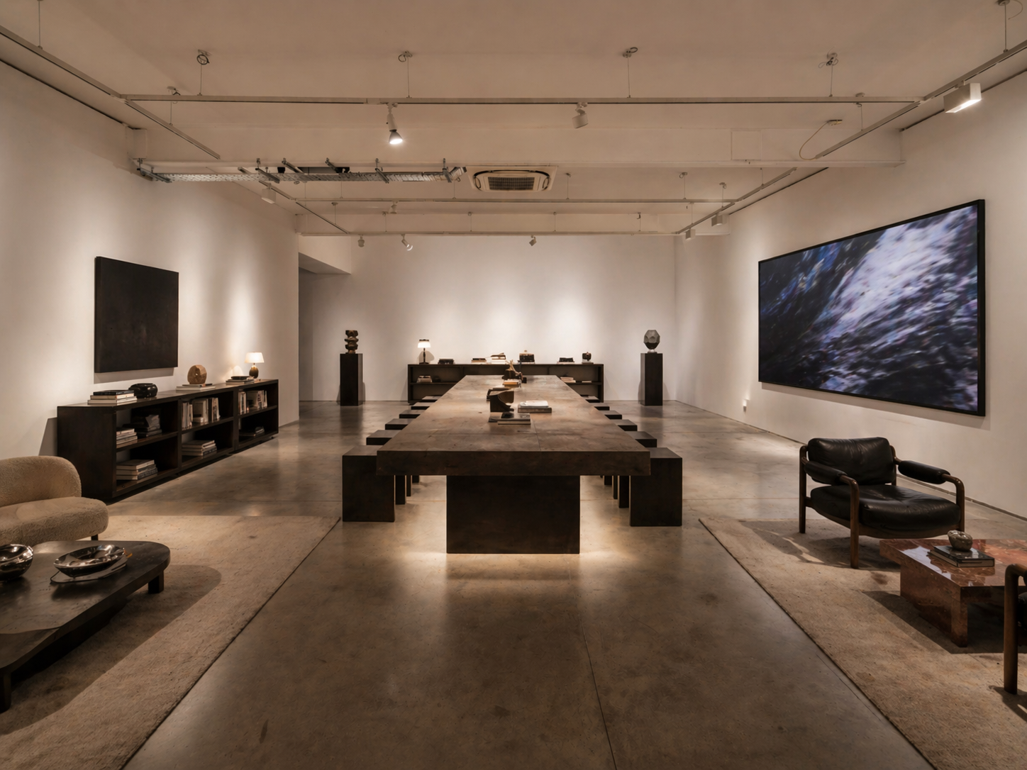 An immersive client-facing salon / presentation chamber / cultural-tech showcase space