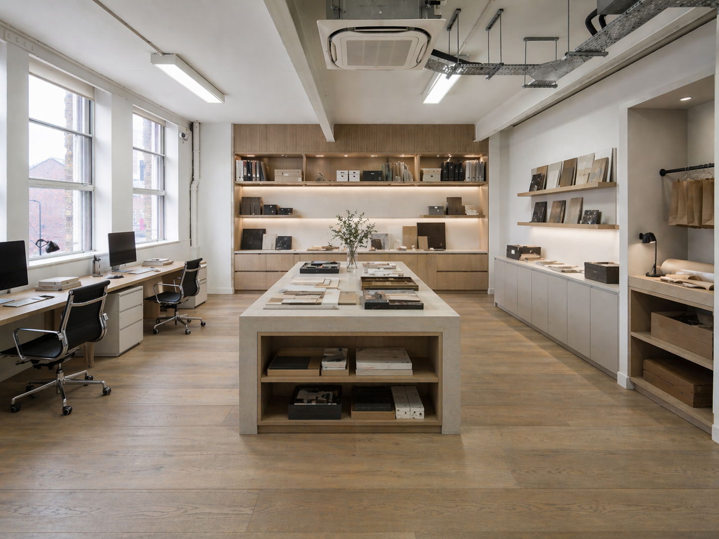 It broadens appeal to furniture, beauty, fashion, lighting, and interiors occupiers who need both workspace and presentation value.